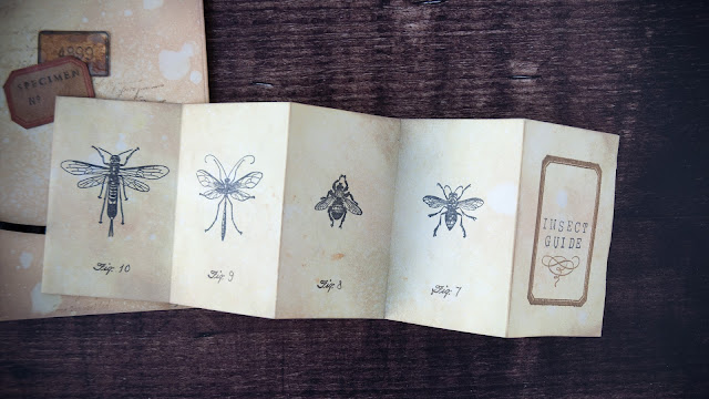 But the real focal of this double-spread is the little insect guide on the left page. It's very unassuming when closed, but when opened... I just love these images SO much. They're all from Tim Holtz's Entomology stamp set, one of my faves, I use the text stamp from that set all the time, so it was high time to bring the insects into this project!